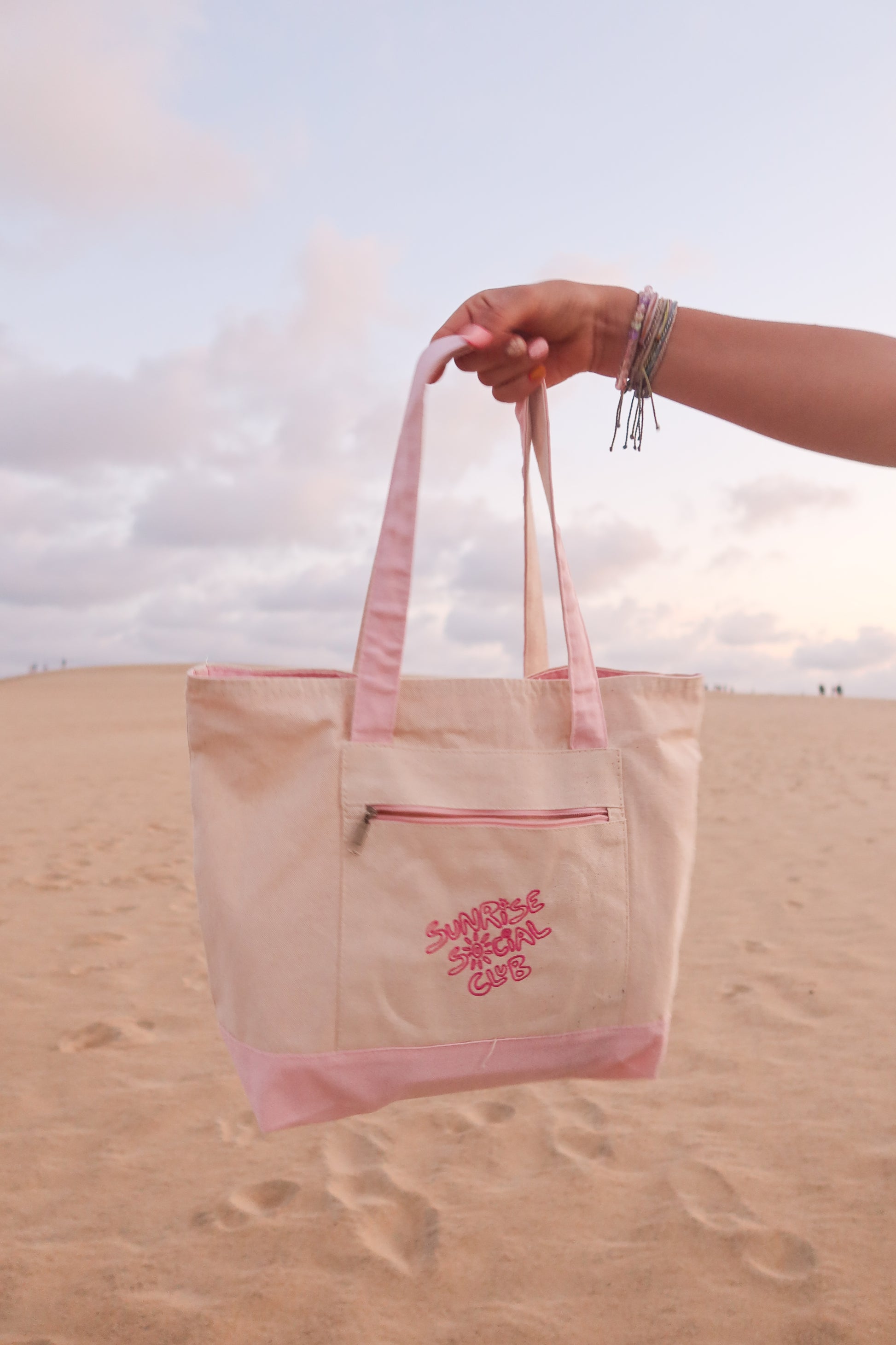 Carry a little sunshine with you everywhere. This 19L heavy cotton canvas tote features “you are my sunshine” embroidered in Ava’s own handwriting on one side and a Sunrise Social Club logo embroidered in pink on the other. There is a secure zipper closure on the top, and extra storage up front, so it’s the perfect everyday bag for the beach, the market, or your daily adventures.